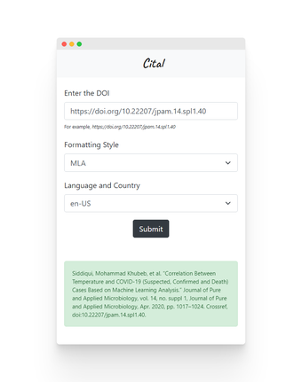 Cital to rozszerzenie przeglądarki Firefox, które automatycznie generuje cytaty na podstawie DOI dokumentów. Obsługuje różne style formatowania, co czyni go wszechstronnym narzędziem dla studentów i badaczy. Użytkownicy mogą korzystać z pięciu stylów cytowania: APA, BibTeX, MLA, Harvard oraz Vancouver, co pozwala na łatwe dostosowanie do wymagań różnych publikacji.